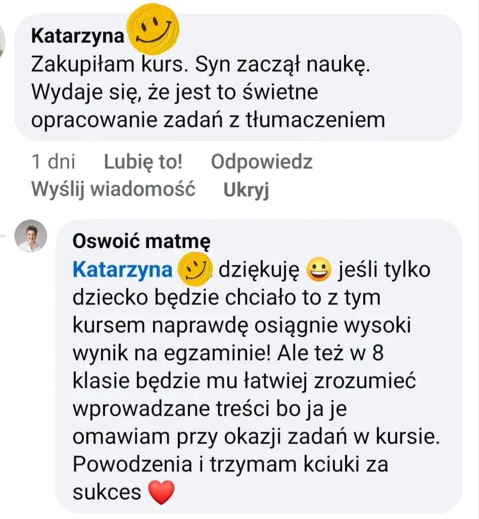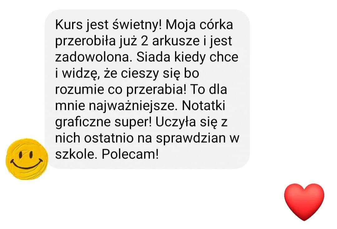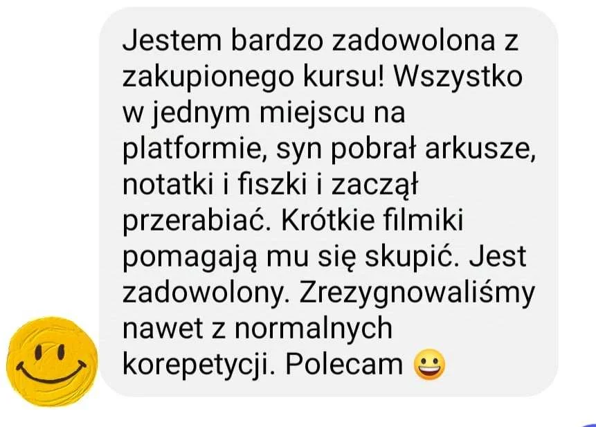 Aby pomóc Twojemu dziecku stworzyłam kursy wideo oparte na arkuszach egzaminacyjnych gdzie w wygodnych, krótkich lekcjach, omawiam prostym językiem, pokazując krok po kroku jak rozwiązać poszczególne zadania, jak analizować treść i zdobywać maksymalną ilość punktów: